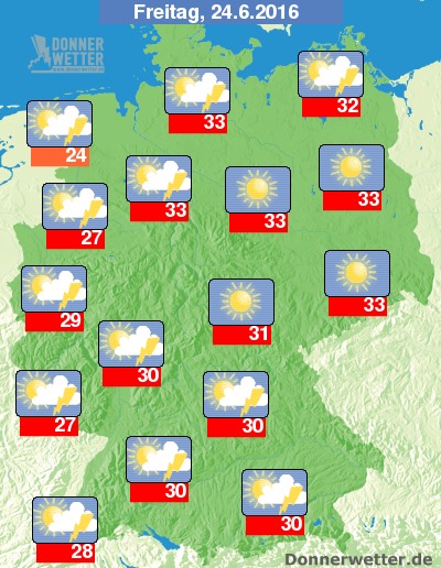 Am Freitag bestimmen noch schwül-heiße Temperaturen unser Wettergeschehen. Dabei muss vielerorts mit Schauern und Gewittern gerechnet werden, allein in der Osthälfte zeigt sich meist strahlender Sonnenschein. Hier werden am Freitag mit Werten um 33 Grad C auch die bundesweit höchsten Temperaturen erreicht. Im restlichen Land liegen sie bei fast schon angenehmen 24 Grad C in Ostfriesland und um 32 Grad C an der Ostseeküste.