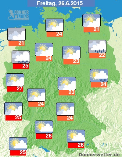 Am Freitag ist es im Süden des Landes meist heiter bis sonnig und dazu trocken. Im Norden ist es oft stark und zum Teil aufgelockert bewölkt mit vereinzelten Schauern. In der breiten Mitte ist es größtenteils wechselnd und zeitweise auch stark bewölkt bei nur seltenen Schauern. Die Temperatur steigt auf 21 Grad in Rostock und bis 27 Grad in Köln.
