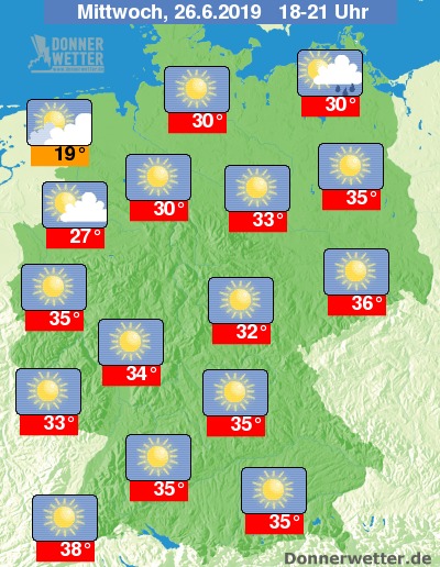 Die Temperaturen liegen am frühen Abend im nordwestlichen Niedersachsen bei angenehmen 19 bis 25 Grad, weiter landeinwärts wird es aber rasch wärmer. Oft werden noch schweißtreibende Werte zwischen 30 und 38 Grad gemessen.