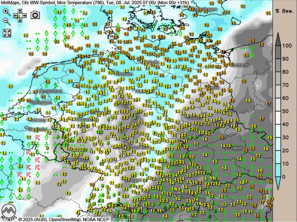 Die Wetter- und Temperaturkarte für Dienstagfrüh (07:00 Uhr) nach GFS: