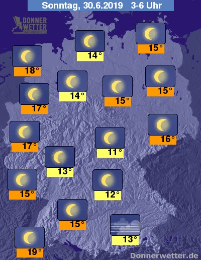 In der kommenden Nacht bleibt der Himmel bundesweit sternenklar und dabei bleibt es auch trocken. Die Temperatur sinkt auf sehr milde 19 Grad im Breisgau und bis auf 11 Grad am Thüringer Wald.