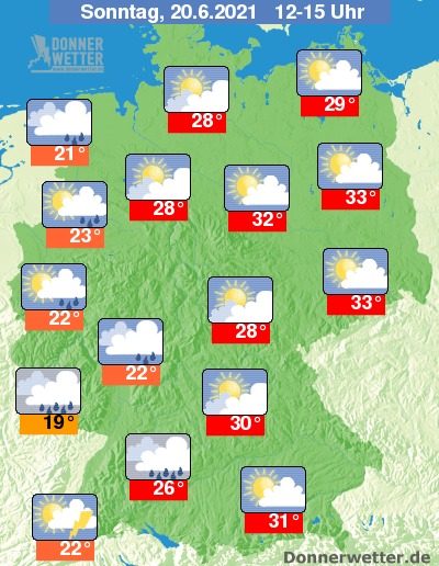 Heute Nachmittag zeigen sich zum Teil heitere Abschnitte, teils ziehen dichte Wolken durch. Besonders im Süden, aber auch im Westen des Landes bilden sich gebietsweise Schauer und örtliche Gewitter, sonst bilden sich hier und da einzelne Schauer und örtlich auch Gewitter. Die Temperatur liegt bei 21 Grad im nördlichen Emsland und bis 33 Grad in der Lausitz.