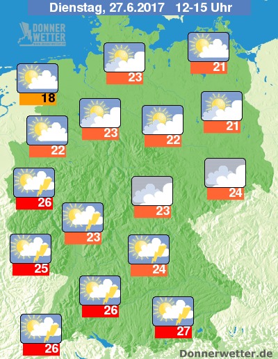 Heute Nachmittag ziehen bis einschließlich südlich zu einem Streifen vom nördlichen NRW bis rüber nach Sachsen oft dichte Wolken durch, die häufig Schauer und auch örtliche Gewitter bringen. Nördlich des genannten Streifens bleibt es hingegen wechselnd bis aufgelockert bewölkt und trocken. Die Temperatur liegt zwischen 18 und 27 Grad.