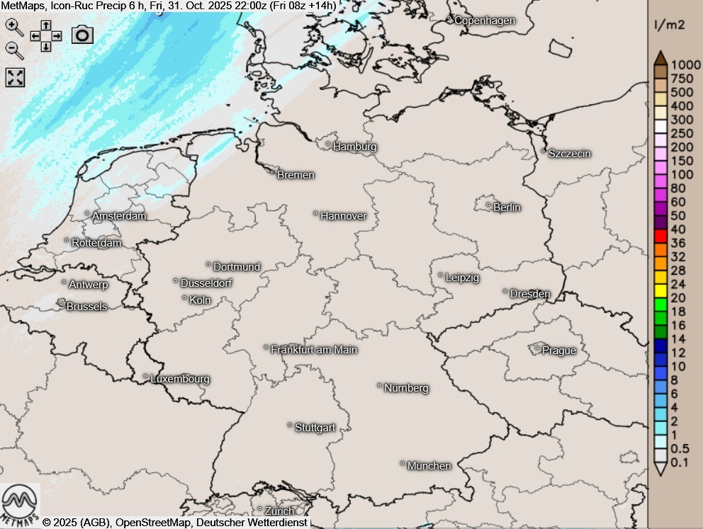 Die Bewölkungs- und Temperaturkarte für Freitagnachmittag (15:00 Uhr) sowie die Sechs-Stunden-Regenmengen bis 22:00 Uhr nach Icon-Ruc: