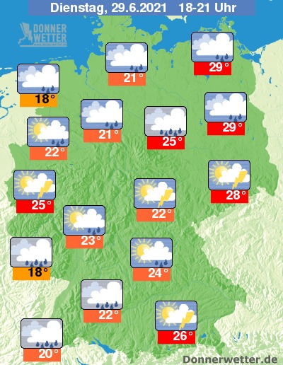 Heute Abend ist es über dem Norden und Osten meist dicht bewölkt, im übrigen Land ist es teils locker, teils dicht bewölkt. Es bilden sich landesweit Schauer und vielerorts auch Gewitter. Die Temperatur liegt bei etwa 18 Grad in Cuxhaven und bis 29 Grad in Berlin.