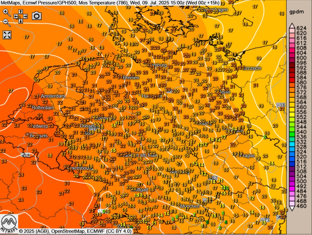 Die Luftdruck- und Temperaturkarte nach ECMWF für Mittwochnachmittag (15:00 Uhr):