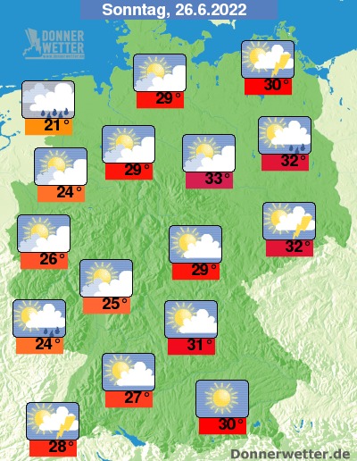 Am Sonntag bleibt es im Süden meist sonnig und trocken, im übrigen Bundesgebiet ist es teils heiter, teils ziehen einige Quellwolken auf, dabei bilden sich lokale Schauer und auch Gewitter sind möglich. Die Temperatur erreicht 21 Grad an der Nordsee und bis 33 Grad in der Magdeburger Börde.