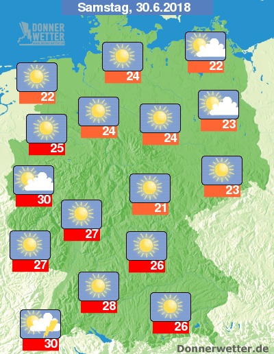 Die Temperaturen erreichen im Tagesverlauf Werte um 22 Grad C an den Küsten und heißen 30 Grad C im Westen und Südwesten Deutschlands.