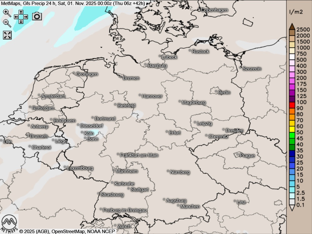 Die Strömungs- und Temperaturkarte für Freitagfrüh und die 24-Stunden-Regenmengen für Freitag nach GFS: