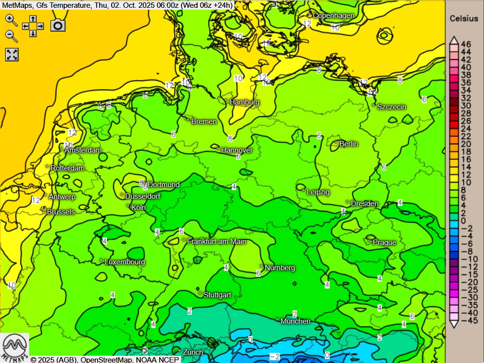 Die Lufttemperaturen am Montagmorgen (06:00 Uhr) sowie die 24-Stunden-Regenmengen am Donnerstag nach GFS: