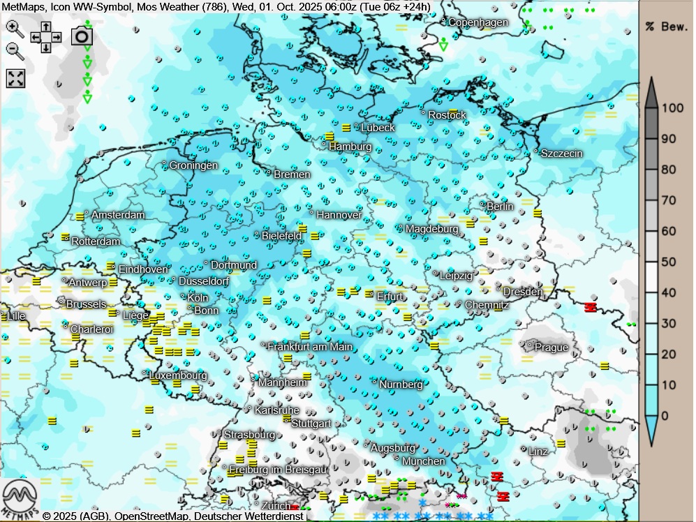 Am Mittwoch zeigt sich der Himmel nach Auflösung von Nebel und Hochnebel zunächst verbreitet wechselnd oder stark bewölkt. Im Tagesverlauf lockert es dann häufig auf, vor allem im Nordwesten sind auch längere sonnige Abschnitte möglich. Im Südosten sind am Mittwoch einzelne Schauer möglich, sonst bleibt es heute trocken.