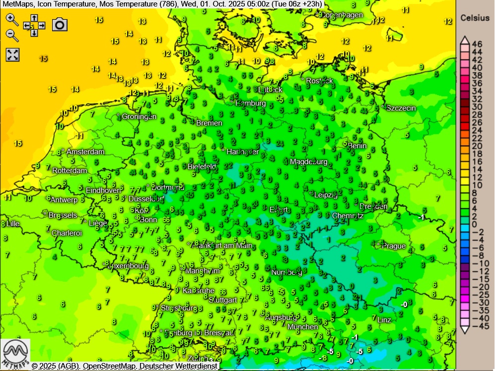Die Lufttemperaturen sowie die Wetterkarte für Mittwochmorgen nach Icon: