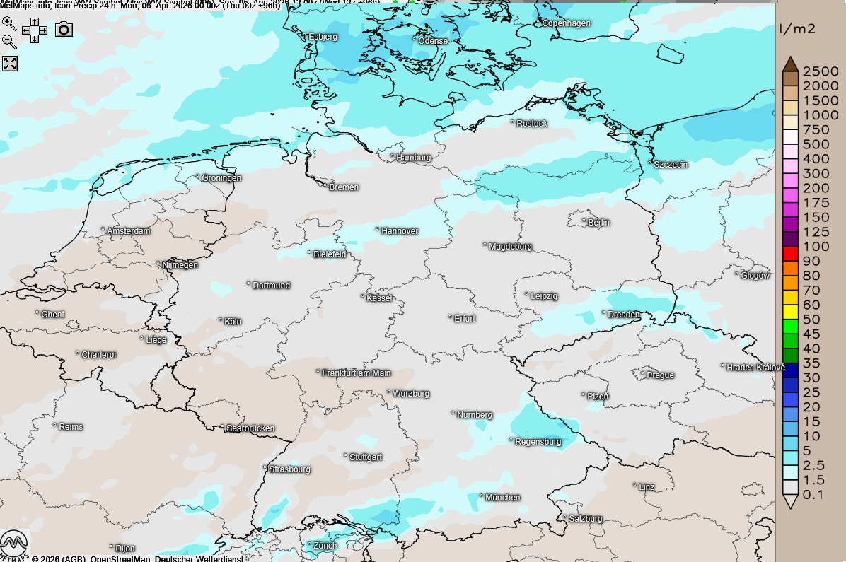 Die Wetterkarte für Sonntagfrüh (09:00 Uhr), die Lufttemperaturen um 15:00 Uhr sowie die 24-Stunden-Regenmengen nach ICON: