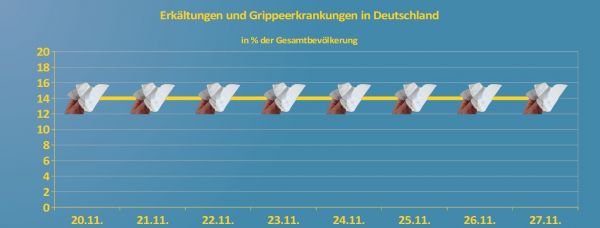 Da liegt es nah, dass sich auch die Erkältungs- und Grippezahlen auf einem deutlich erhöhten Niveau bewegen. Im Laufe der Woche husten und niesen bis zu 14 Prozent der Bürger.