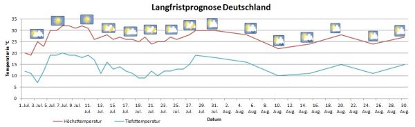 Auch in unserer aktuellsten Langfristprognose rechnen wir für Deutschland mit einem eher durchschnittlichen Sommer. Zwischen Anfang und Mitte Juli schwappt zwar nochmals eine kurze Wärmewelle über unser Land hinweg, mit Gewittern folgt dann aber schon schnell wieder eine Abkühlung. Durchschnittlich geht es dann weiter. Kühle Phasen wechseln mit passablem Sommerwetter ab. Der Sommer 2014 ist insgesamt wechselhaft und nicht heiß.