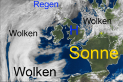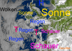 ![]() | | Satellitenbild 15.04.2020 Große Sonneninsel umgeben von Wolken |