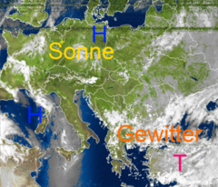 Zahlreiche kleinräumigere Gewitterzellen über Südosteuropa