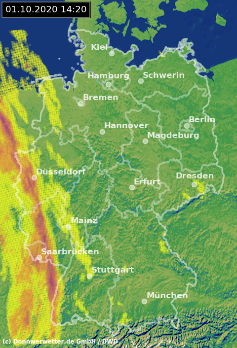 Im Westen erkennt man teils stärkere Signale mit Regen. Dieses Regenband gehört zu einer Front, die in den nächsten Stunden noch etwas weiter in unser Land hereinzieht, sich aber am Abend abschwächt und Richtung Nordsee abdriftet. Die dadurch entstehenden Niederschlagsmgenen erreichen dabei meistens zwischen 1 und 7 Liter pro Quadratmeter.