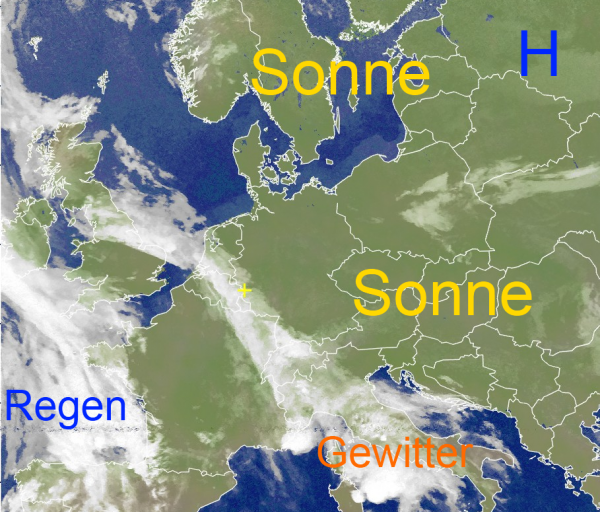 Kompaktere Wolken mit Regen befinden sich über der Biskaya. Diese erreichen in der Nacht auf Freitag den Westen unseres Landes, schwächen sich dabei allerdings deutlich ab, so dass abgesehen einiger Tropfen oder schwacher Schauer kein nennenswerter Regen fallen wird.