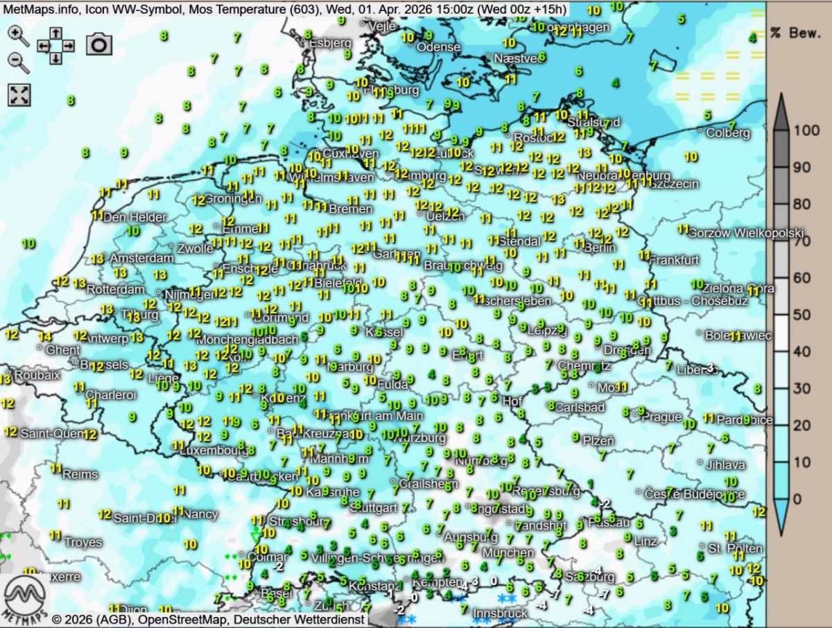 Die Wetter- und Temperaturkarte für Mittwochnachmittag (15:00 Uhr) nach ICON: