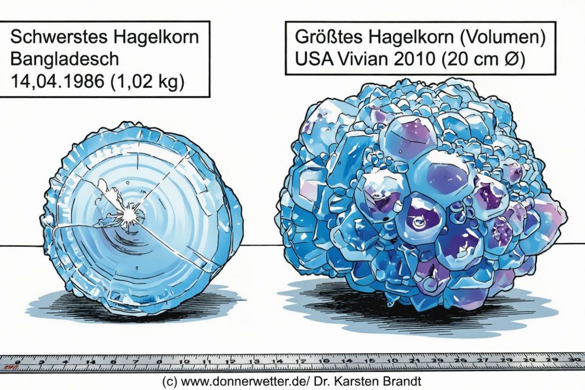 Zum Vergleich: Das bislang größte Hagelkorn nach Volumen wurde im Jahr 2010 in den USA dokumentiert. Es verdeutlicht, welche Dimensionen Hagel unter extremen Bedingungen annehmen kann.