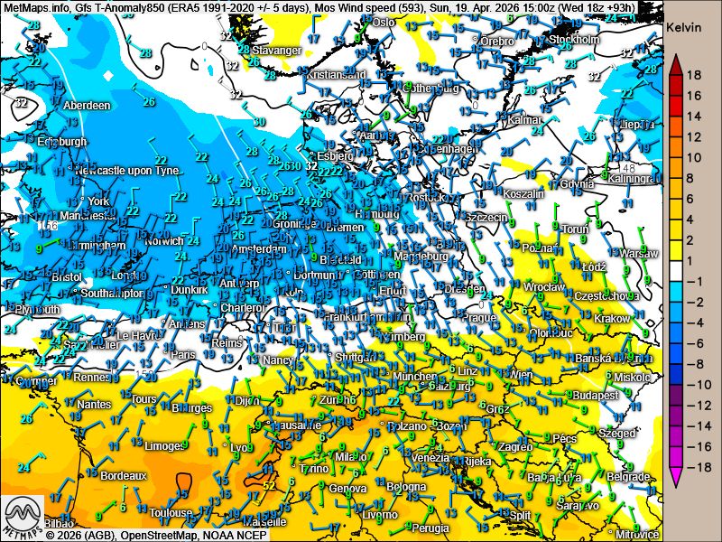 Die Temperaturanomalie mit Windgeschwindigkeiten für Sonntagnachmittag sowie die Temperaturkarte für Dienstagfrüh (06:00 Uhr) nach GFS: