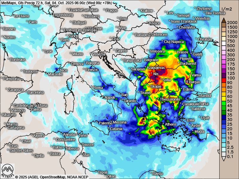 Die Karte zeigt die akkumulierten 72-Stunden-Regenmengen für Südosteuropa bis Samstagfrüh.