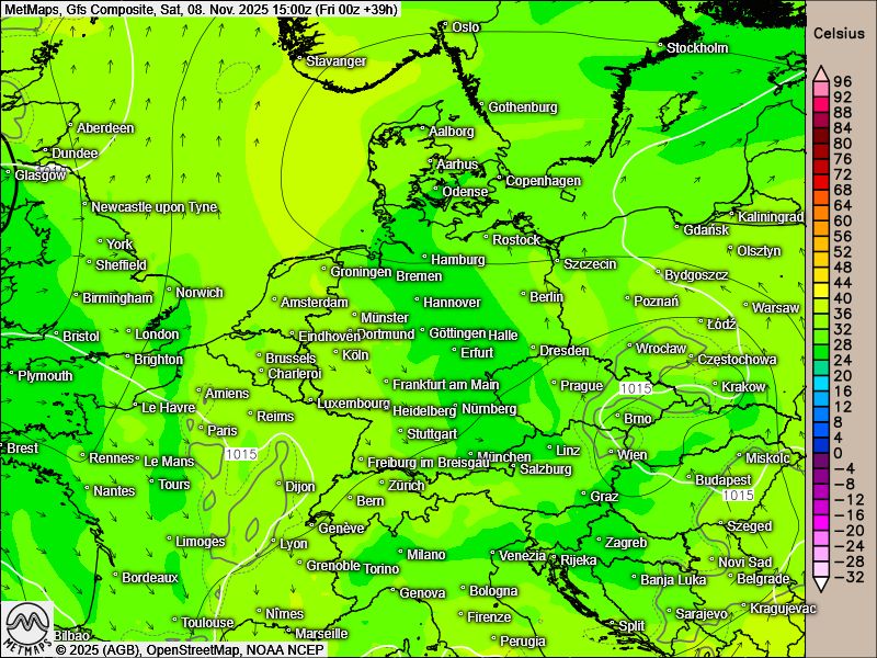 Die Strömungskarte für Samstagnachmittag sowie die Wetterkarten für Samstag und Sonntag (15:00 Uhr) nach GFS: