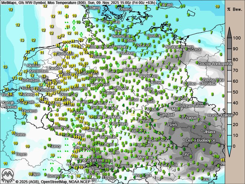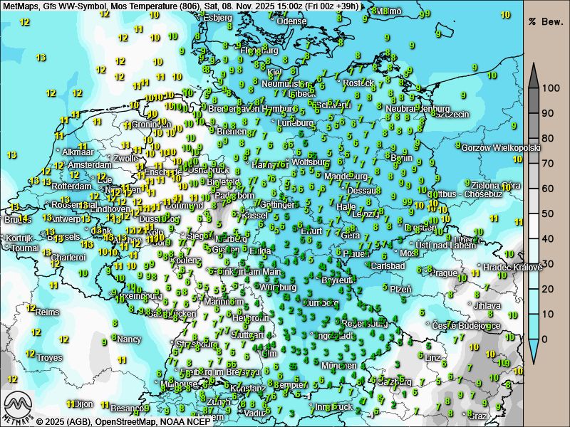 Im Norden und Westen sind am Wochenende weiterhin Temperaturen um 13 bis 14 Grad zu erwarten, deutlich kühler wird es dagegen im teils nebelverhangenen Süden und Osten.