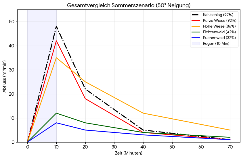 Der entscheidende Unterschied zeigt sich zwischen bewachsenen und unbewachsenen Flächen: Während Kahlschlag nahezu den gesamten Niederschlag direkt abführt, können Wiesen – insbesondere höhere Bestände – den Abfluss lediglich etwas verzögern, aber nur begrenzt reduzieren. Wälder wirken dagegen als wirksamer Puffer und reduzieren sowohl Spitzen als auch Gesamtabfluss deutlich.