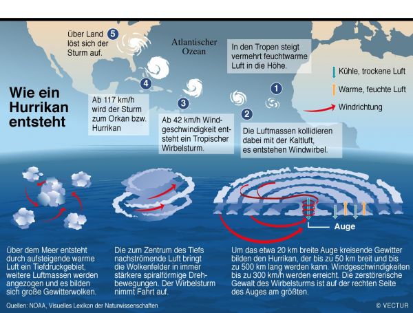Pro Jahr gibt es etwa 50 Wirbelstürme auf der Erde. Sie entstehen nur auf dem Meer und bei Wassertemperaturen oberhalb von 26 Grad, da sich nur bei solch hohen Temperaturen das „Auge“, der warme Kern eines Hurrikanes, entwickeln kann. Daher tauchen Hurrikane nur in den Spätsommermonaten, bei den höchsten Wassertemperaturen des Jahres, auf. Hurrikane entwickeln sich aber nicht am Äquator selber, da zur Rotation des Wirbels die Corioliskraft nötig ist. Daher sind die Gebiete bis 10 Grad nördlich und südlich des Äquators geschützt.